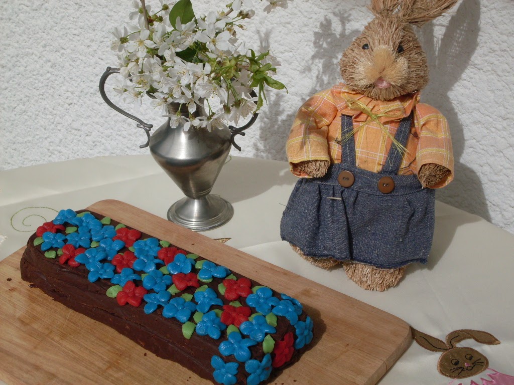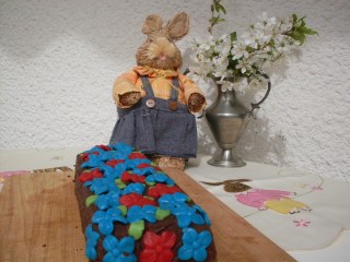 - Dann auf eine Kuchenplatte stürzen und mit Marzipan – Blumen dekorieren.