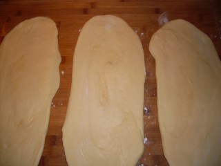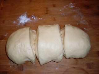 - Den Teig auf ein bemehltes Backbrett geben und in drei Teile teilen.