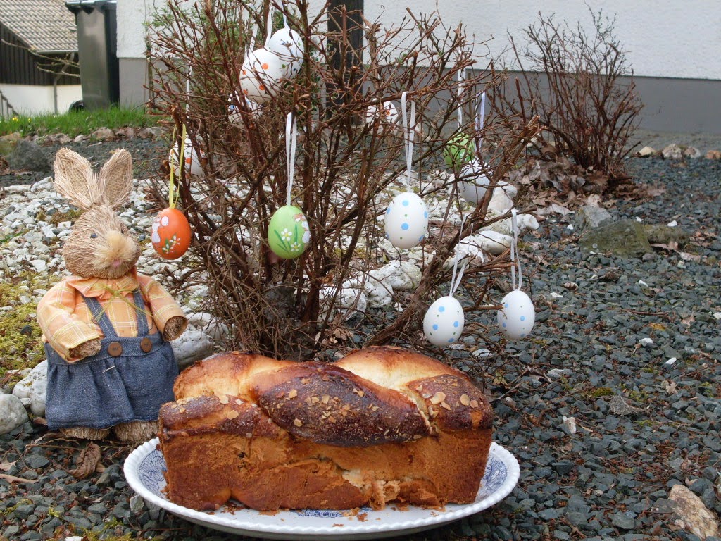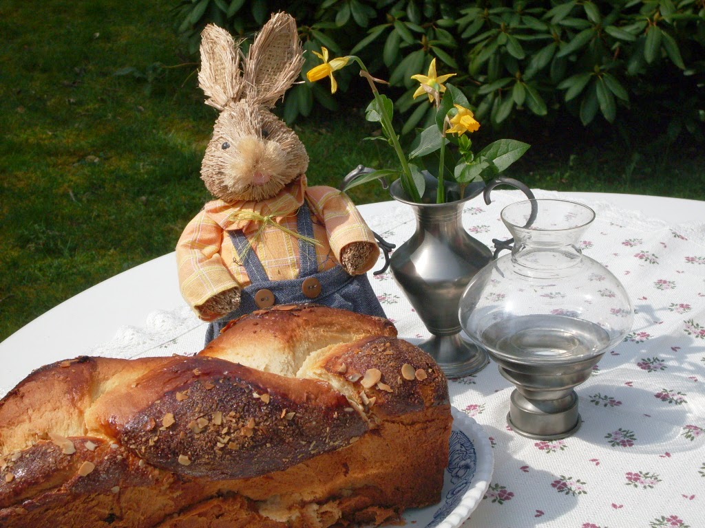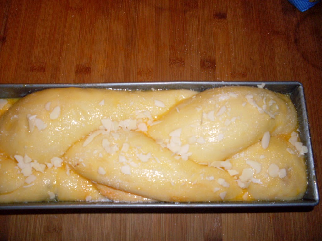 - Den Zopf auf den Kastenform legen, mit Eigelb bestreichen mit Hagelzucker und Mandeln bestreuen und 30 Minuten gehen lassen.