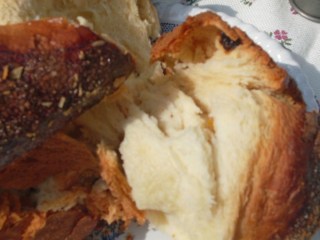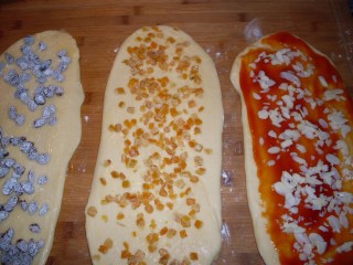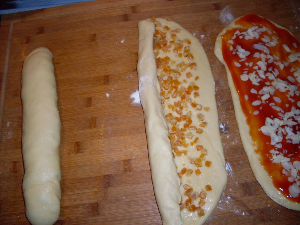 - Mit restliche Butter bestreichen. Der ersten Teig mit Sultaninen bestreuen, der zweiten – mit Kandierte Orangenstücke und der drite – mit Hagebutten Konfitüre bestreichen und Mandeln bestreuen.