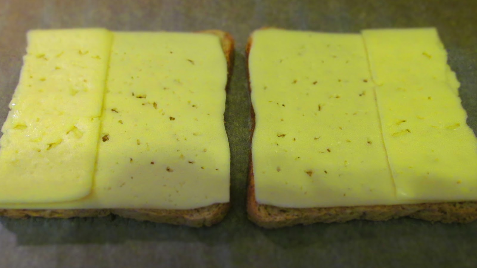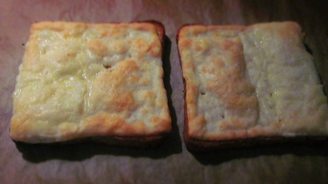 - Върху всяка филийка слагам парче кашкавал и запичам в горещата фурна до разтопяване а кашкавала и до златисто.