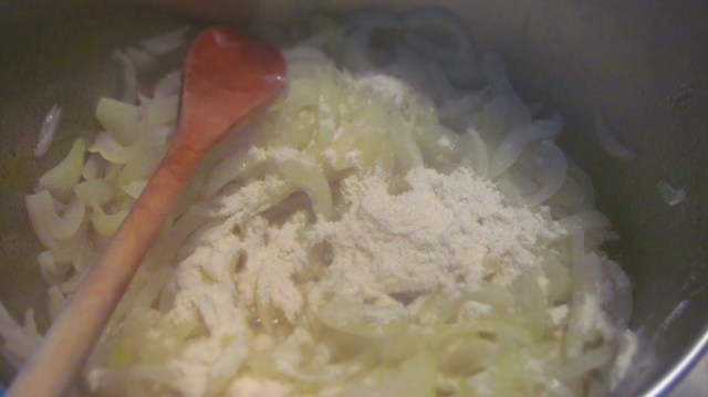 - Намалявам котлона с една степен и добавям брашното, като разбърквам, за да не залепне брашното за дъното на тенджерата. Пържа брашното точно 1 минута при непрекъснато бъркане.