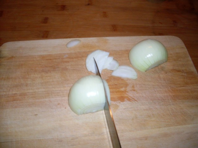 - Почиствам лука и режа на половина. Обръщам половинките върху отрязаната страна и от към късата част на лука режа филийки с дебелина около 3 мм. Така се получават лентички.