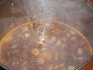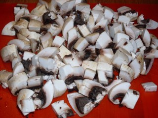 - Пускам първо гъбите и ги изпържвам до омекване. Ако започна с лука – той изгаря много бързо, поради това започвам винаги с гъбите.