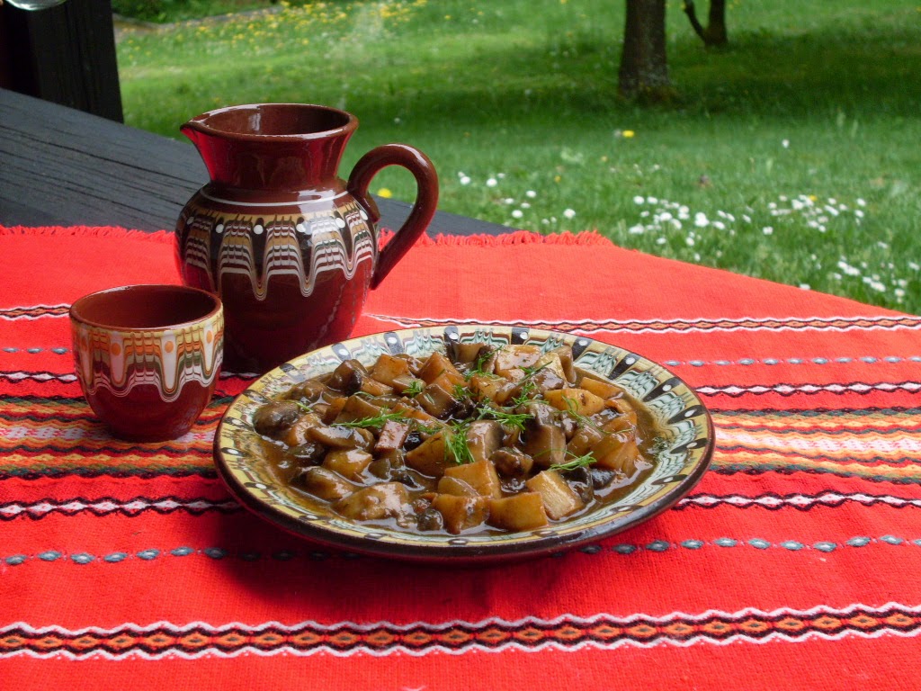 Когато ни се дояде нещо без месо – това е едно от ястията. Много добра комбинация между гъби, картофки и копър. До тази рецепта достигнах преди повече от 20 години, когато още се учех на кулинария и когато рецептите си ги четяхме в старите готварски книги. Прочетох я в книга, която даже не си спомням на кой автор беше, но знам че е от преди 1950 година издадена. Та там имаше много добре описани основни български рецепти. За съжаление книгата остана в България. Но пък ястието е още в главата ми и затова мога да го пресъздам.