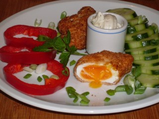 - Öl in einem Topf erhitzen. Pochierten Eier darin 1-2 Minuten braten.