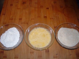 - Mehl, verquirlte Ei und Semmelbrösel mit Parmesan in tiefen Teller geben.