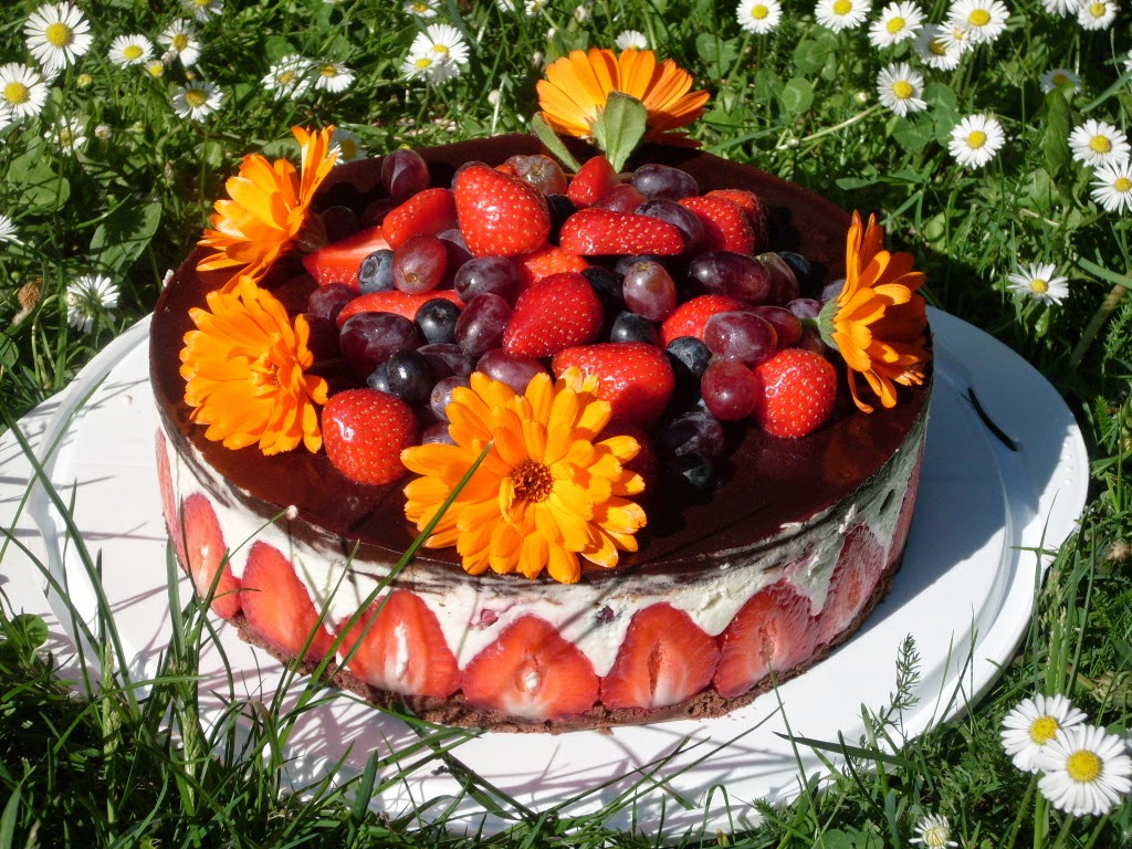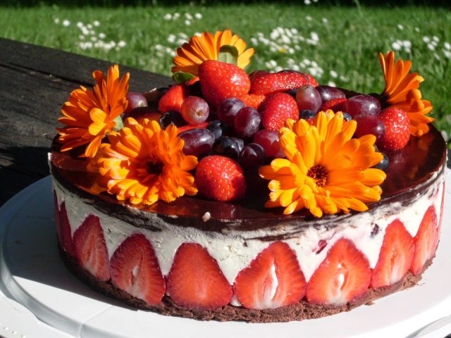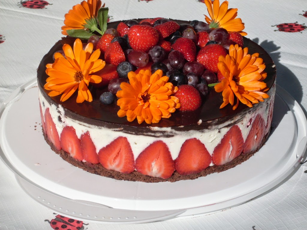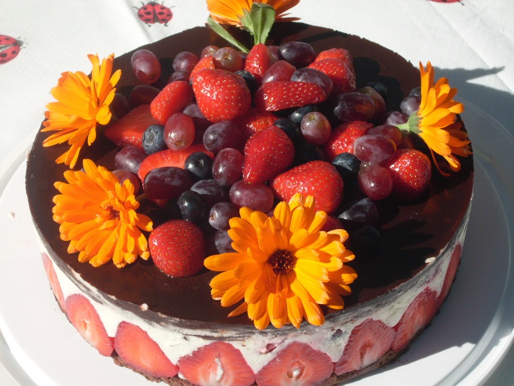 - Когато глазурата се стегна, извадих отново от хладилника и украсих с плодовете.