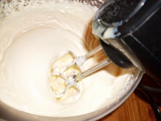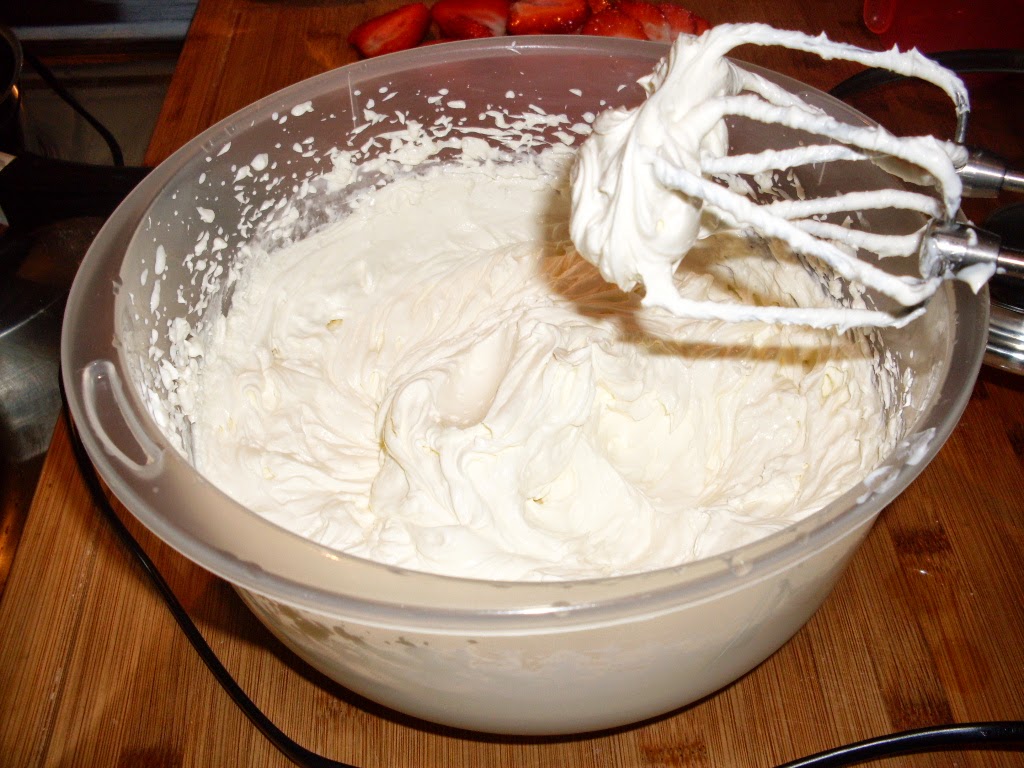 - Отново в подходящ размер купа изсипах маскарпонето, захарта, сметаната и винилиите. Разбих всичко, с помощта на миксер до пухкав крем и разбиването продължи до разтопяването на захарта.