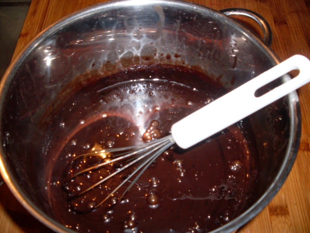 - Разбърквах непрекъснато до пълното разтопяване на шоколада и получаването на хубава еднородна смес. Оставих настрана да поизстине.