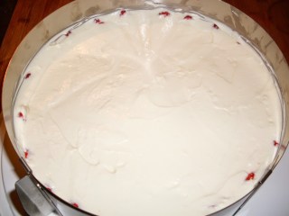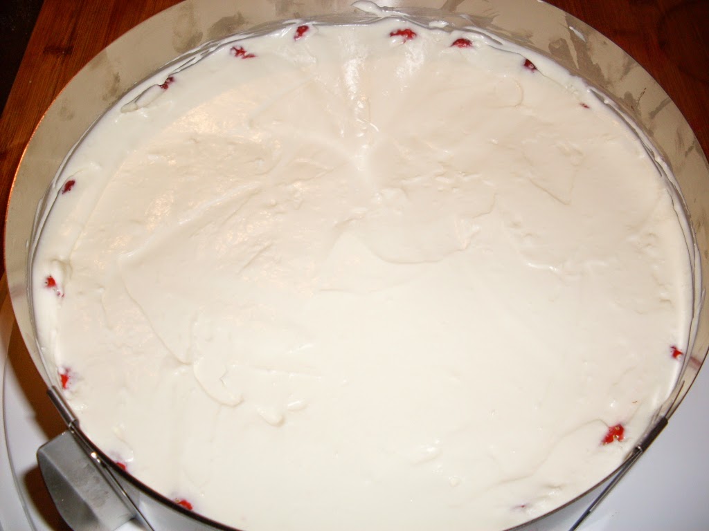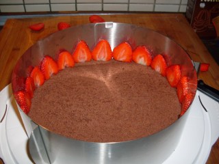 - Сложих ринг за торта, покрай готовия вече кръгъл блат и подредих филийките ягоди.