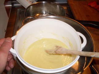 - Разтопих белия шоколад на водна баня. Тук е много важно да не завира водата, ако заври ще се пресече шоколада.