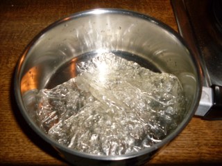 - Сега вече сложих на котлона желатина, на много слаба температура, за да стане течен.