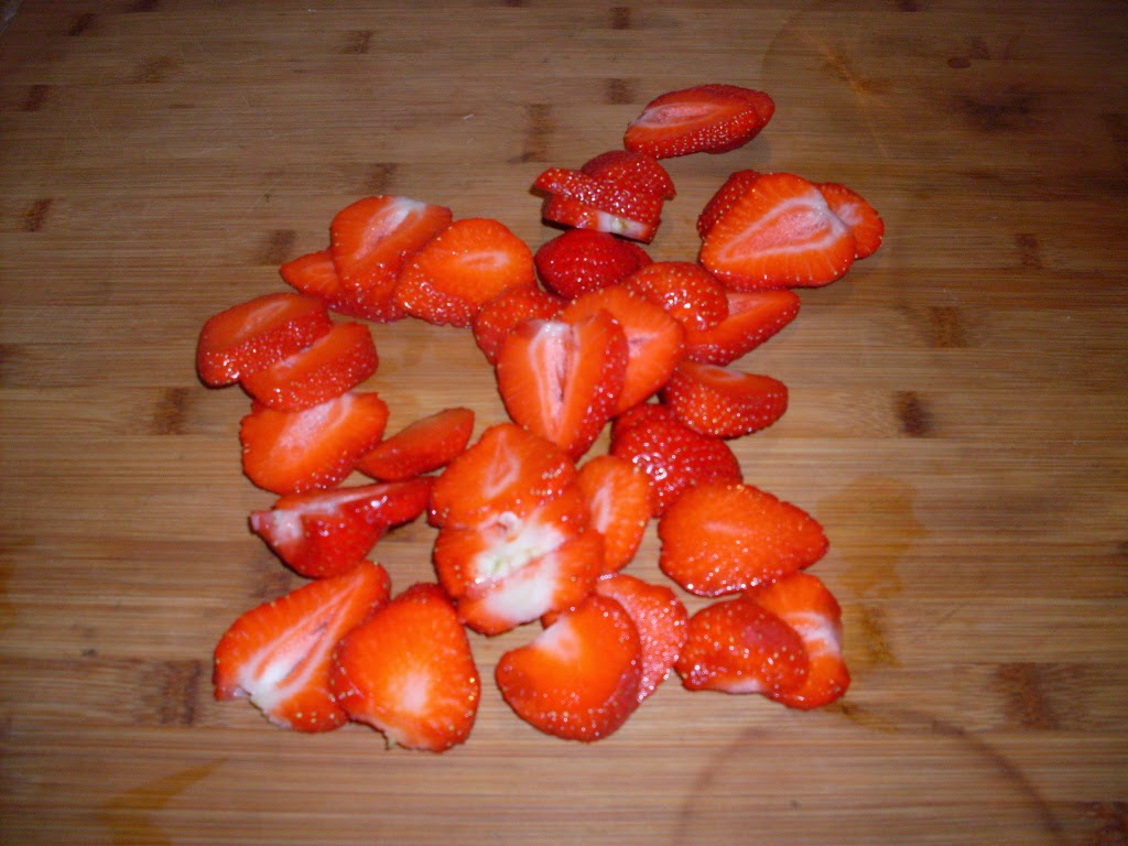 - Добре измити, почистени и отцедени, половината от ягодите ги нарязах на правилни филийки.