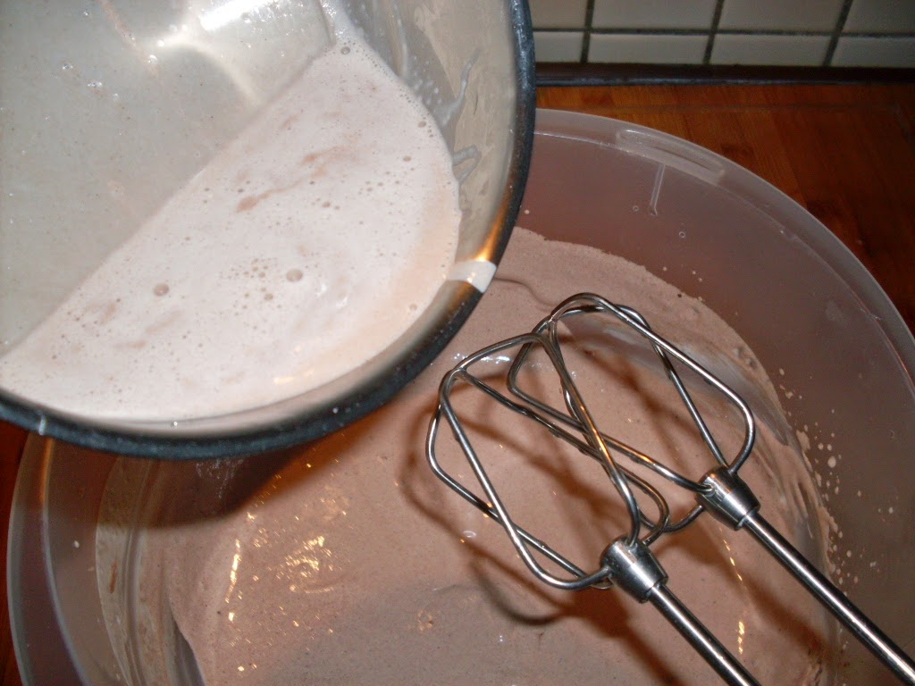 - Брашното и бакпулвера смесих заедно и пресях върху крема. Продължих разбиването с миксер докато се получи еднородна пухкава смес.
