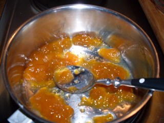 - В подходяща тенджерка изсипах конфитюра от кайсии и 1 с. л. вода и захрях на котлона, докато конфитюра стане течен.