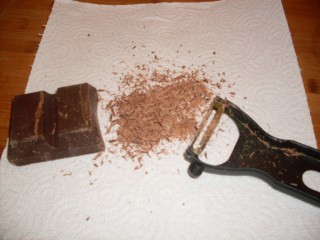 - С помощта на приспособлението за белене на зеленчуци, настъргах кувертюра върху тортата.