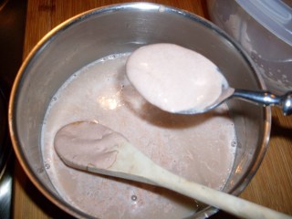 - Към разтопения и леко поизстинал желатин, добавих 3 – 4 лъжици от млечната смес, като непрекъснато разбърквах.
