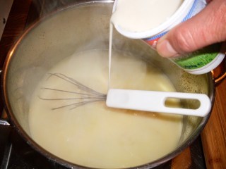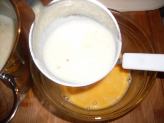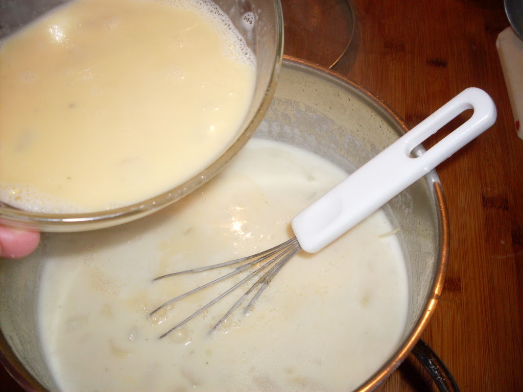 - Така загрятата яйчена смес връщам също бавно и с постоянно бъркане към крем – супата, която не е вече на котлона.