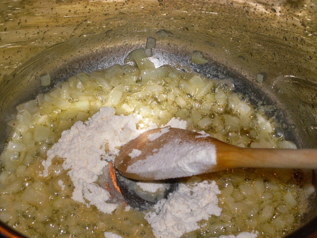 - Добавям към лука двете супени лъжици брашно и при непрекъснато бъркане запържвам около 2 – 3 минути. Внимавам да не потъмнее брашното.