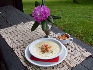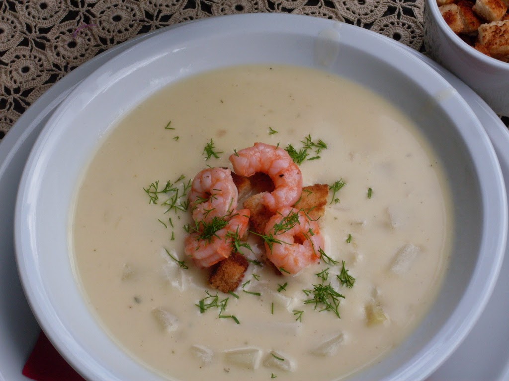 - Сипвам крем – супата в подходяща супена чиния. Аранжирам с крутони и скариди. Поръсвам със ситно нарязан копър.
