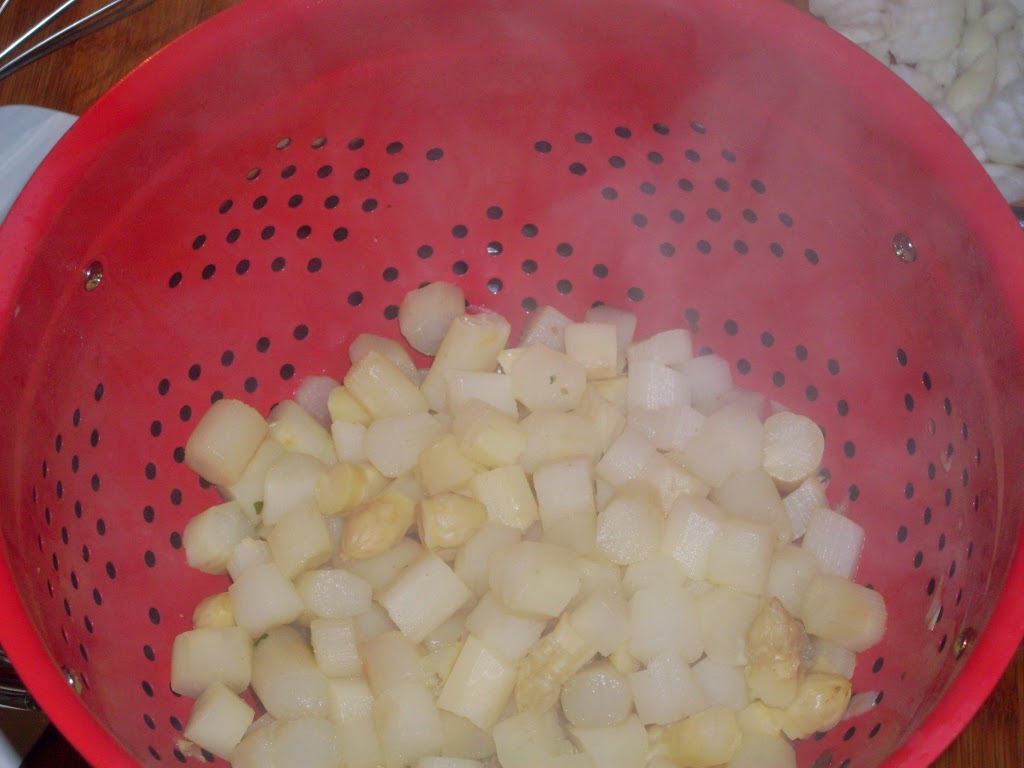 - Аспержите нарязвам на малки кубчета и пускам в бульона да се варят около 5 минути.