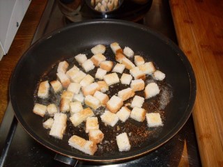 - Пускам предварително нарязаните на кубчета с размер около 1 см. филийки хляб за тостер. Изпържвам до златисто червено. Това са крутоните за супата.