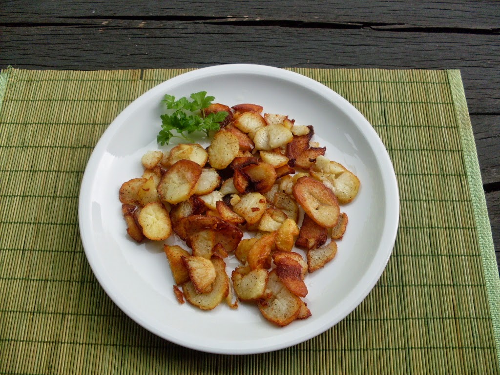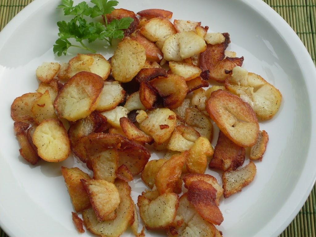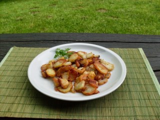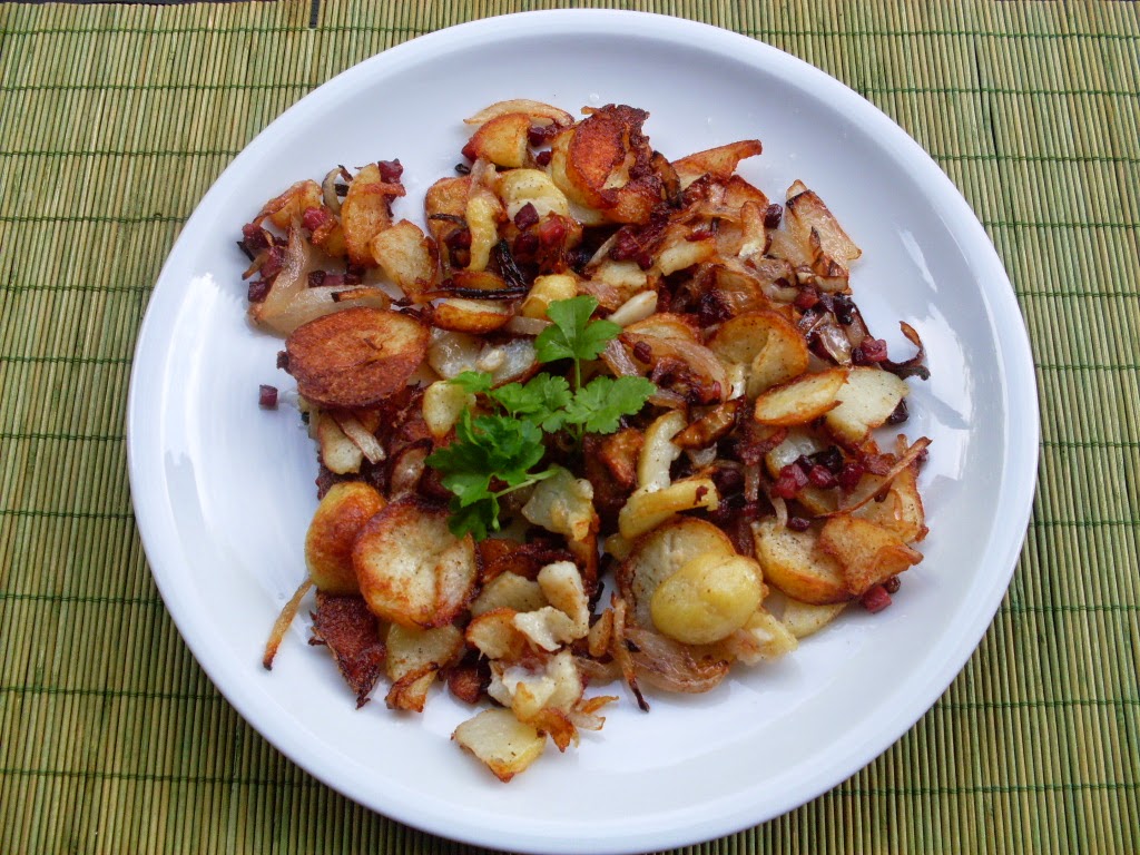 В друг тиган изпържвам кубчета пушени гърди или пушен бекон и лентички кромид лук. Когато лукът поомекне, добавям към почти готовите вече пържени картофи.
