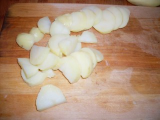 - Сварените и обелени картофи нарязвам на филийки с дебелина около 5 мм. Ако размерът на картофи е голям – първо разполовявам и тогава режа на филийки.