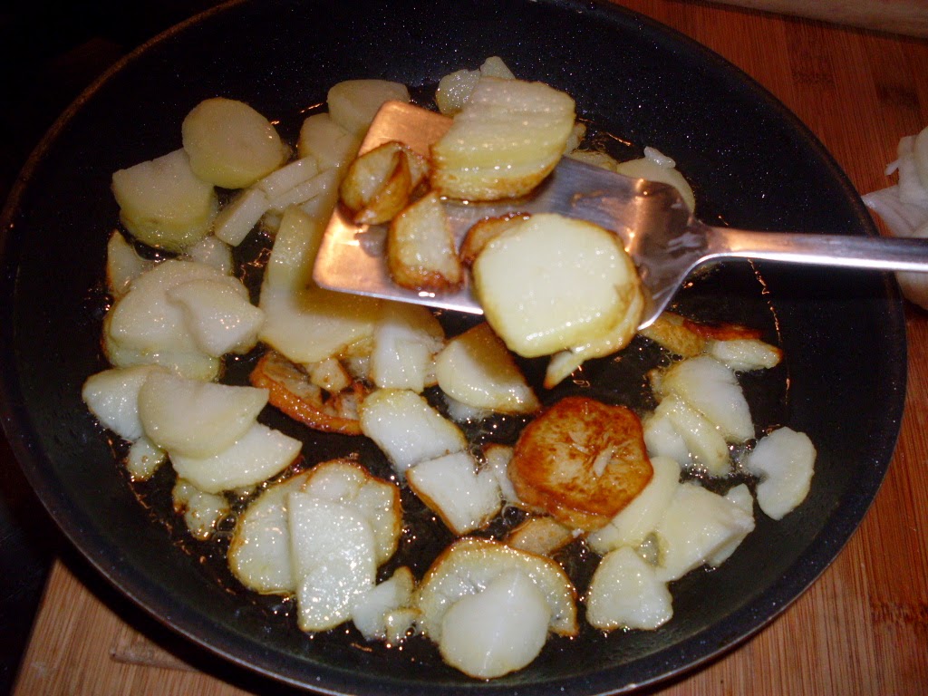 - Обръщането става с метална лопатка, за да не се раздробят. Картофите са почти залепнали за дъното на тигана. Подхващат се внимателно и се обръщат.