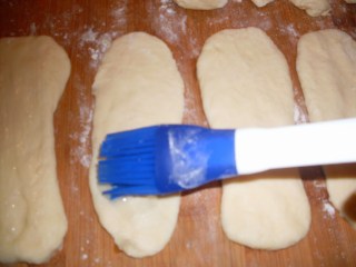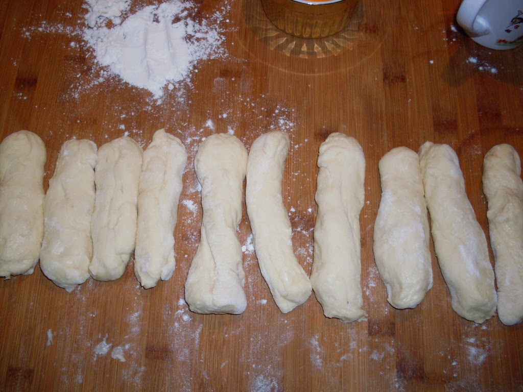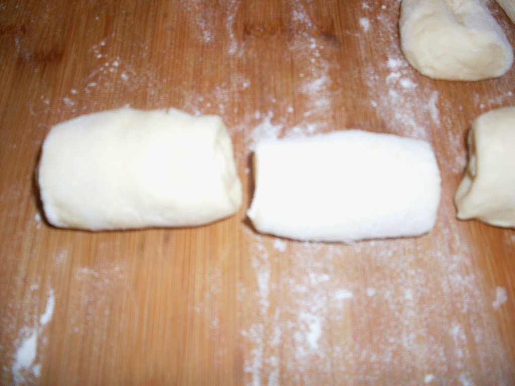 • Всяко парче оформям с ръце на фитил и притискам с пръсти, за да се получат 12  малки продълговати кори с дебелина около 1 см.