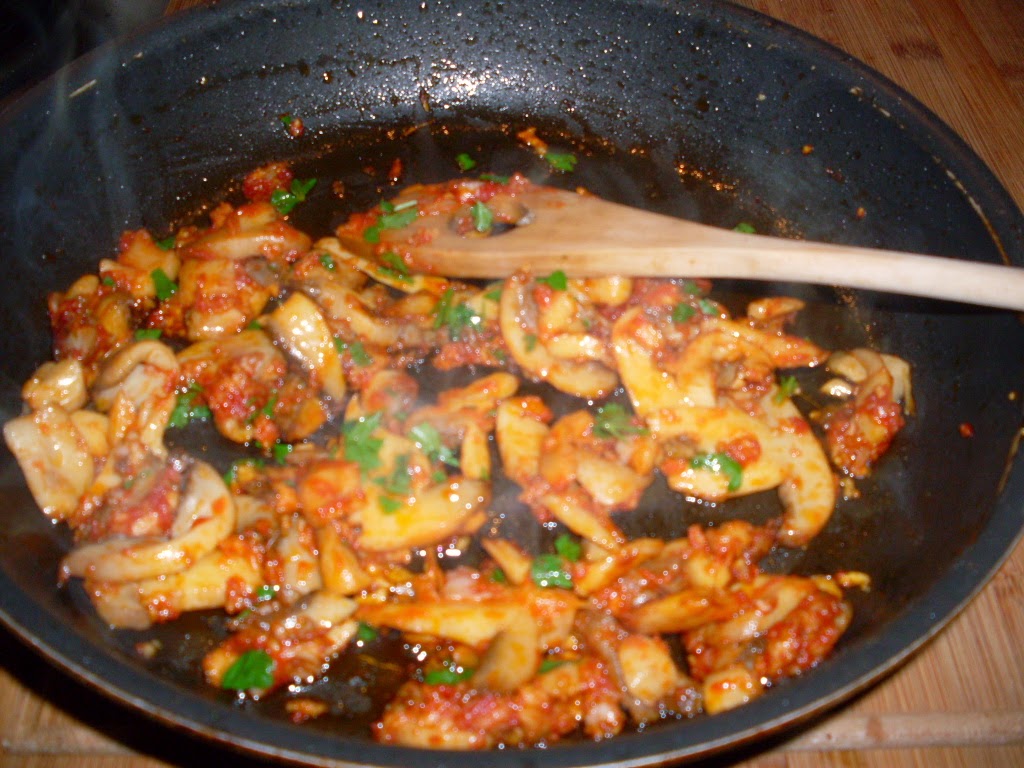 - Когато лукът поомекна добавих доматеното пюре, пресования чесън, сол, черен пипер, лют червен пипер и пресния магданоз. При непрекъснато бъркане задуших сместта.