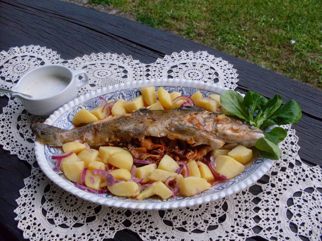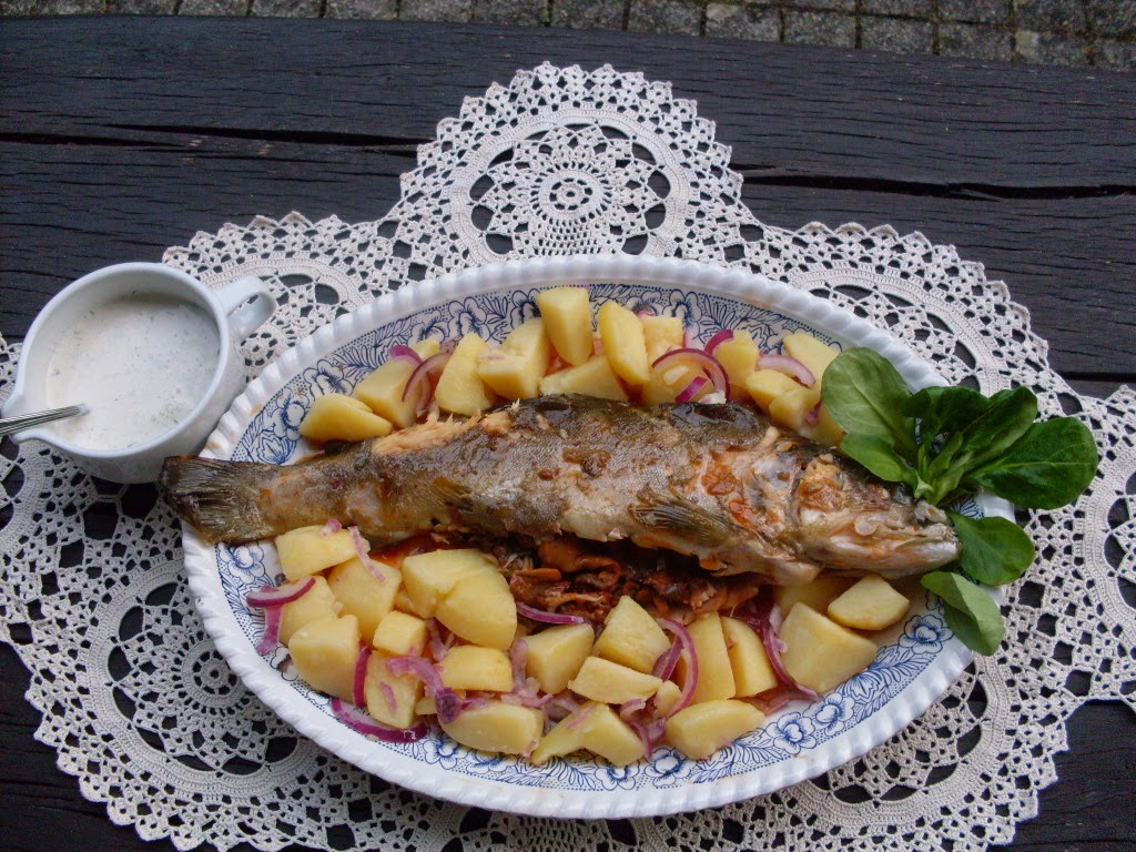 - Готовата риба сервирах с картофена салата и сос от смесените сметана, мляко и пресован чесън, подправен със сол, черен пипер и копър.
