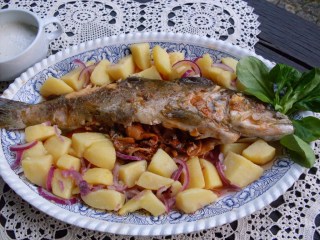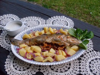 Тези от Вас, които са чели мои предишни публикаци знаят, че работя в един малък хотел – ресторант, находящ се в село със 130 човека население – Gräfendhron. През това село преминава река Dhron, в която има страшно много пъстърва. Много от гостите на хотела идват да ловят риба и така аз получих като подарък прясно уловена пъстърва. Аз обаче се потопих отново в спомените си и много исках да я приготвя като пъстървата, която бях яла на язовир Доспат – поредното живописно кътче от България. Тъй като естествено не си спомням рецептата за Доспатска пъстърва, порових се в интернет и попаднах на една от Рея Фиш и по този начин приготвих тази 40 сантиметрова пъстърва. Имахме едно вкусно изживяване и си заслужава и Вие да опитате!