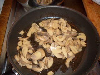 - Гъбите, ако са пресни се измиват и нарязват на тънки филийки. Аз използвах гъби от консерва.