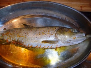 - В подходящ по размер на рибата съд, загрях останалата част от олиото. Поръсих мазнината с малко сол. По този начин няма опасност рибата да залепне за съда по време на пърженето. Пържих рибата на средна степен на котлона. Ако е много силен котлона има опасност рибата да залепне за тигана.