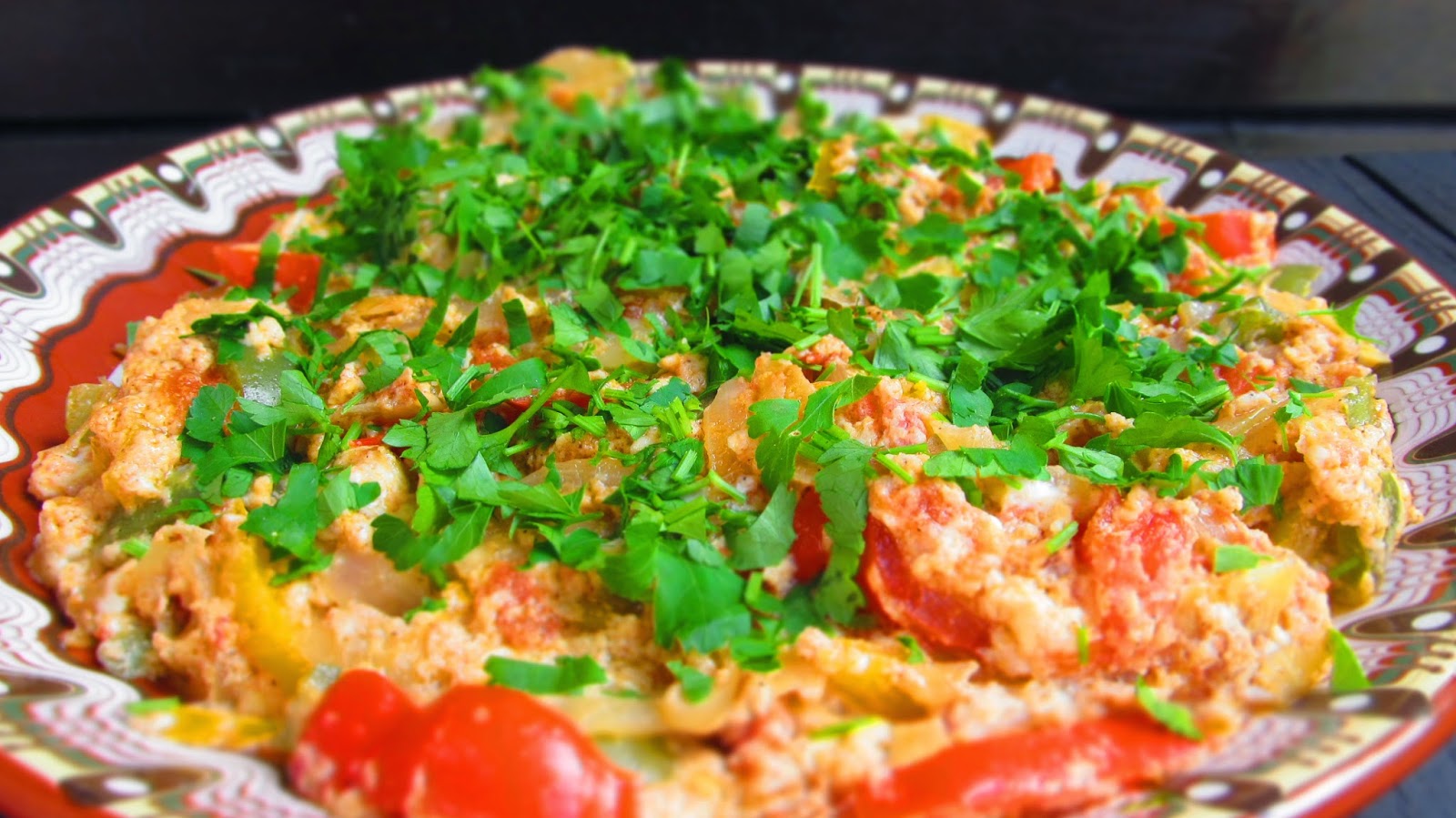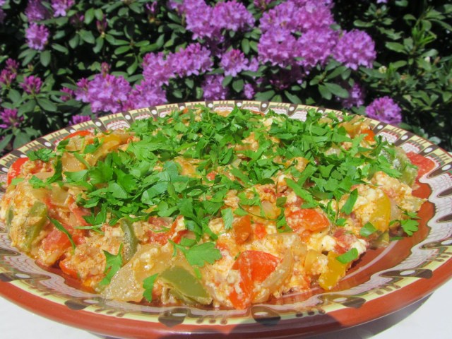 Миш – маш! Познат на всички! Ястие, което има страшно много варианти на приготвяне в различните райони на България. Ястие, което дори при мен е претърпяло страшно много промени в рецептите. Докато бях по-млада и децата бяха малки, за да могат и те да го харесат, печах чушките най-напред, обелвам и нарязвам на ситно. Лукът винаги беше нарязан на много ситно, а сега предпочитам да е на лентички. Доматите винаги и досега са били обелени. Преди години обичах зеленчуците да са добре изпържени, а сега предпочитам да са леко хрупкави и да усещам вкуса им. И много важно – присъствието на много цветове. Купувам винаги поне три различни цвята чушки, хубави червени домати и българско сирене натрошено на едро.