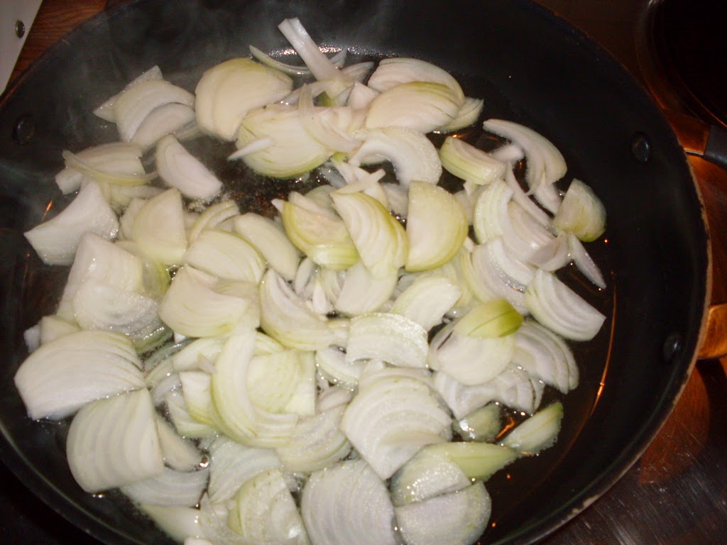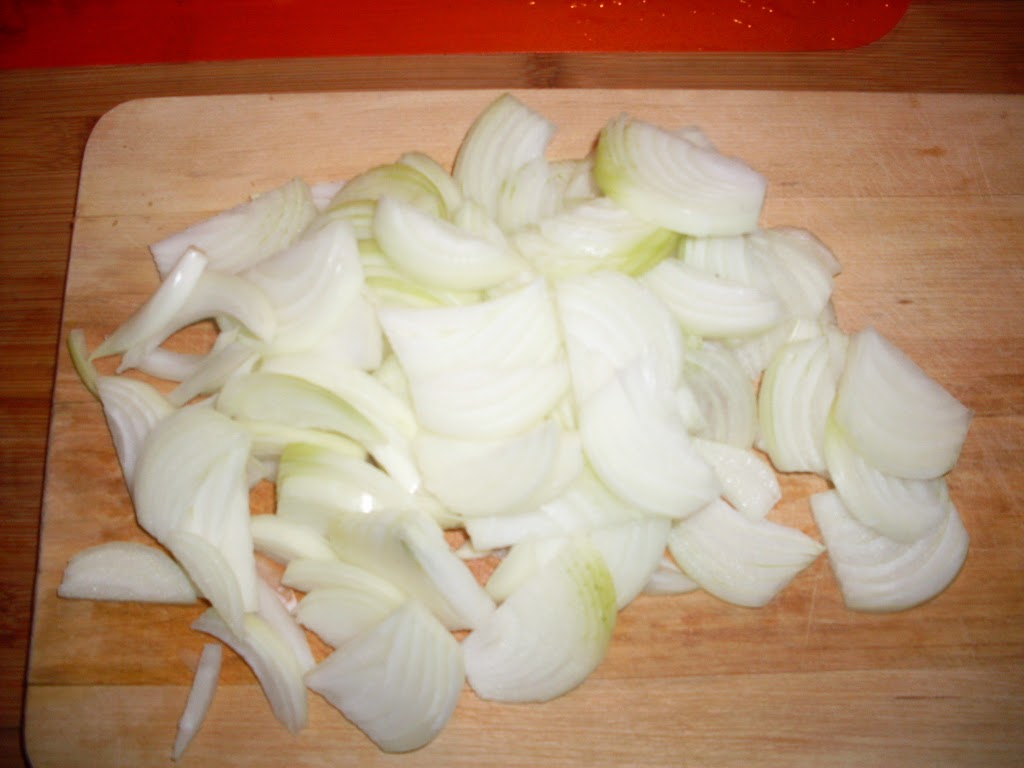 - Обелвам лука и го нарязвам на лентички – режа на половина и откъм късата част, нарязвам на филийки. Така се получават лучени лентички.