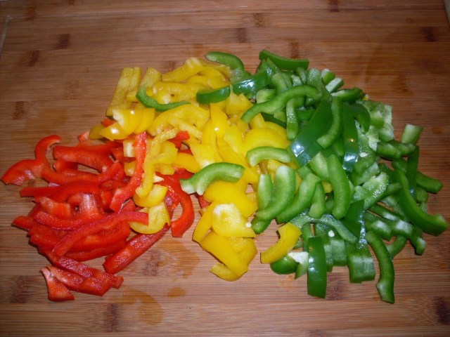 - Измивам и почиствам чушките от семената. Нарязвам също на лентички.