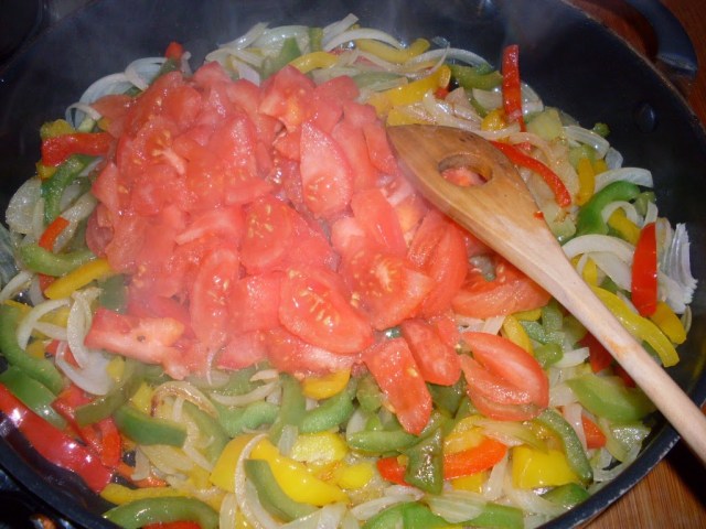 - Добавям доматите и пърженето продължава на 2 степен на котлона, докато изври водата от доматите и ястието остане на „мазнина“.
