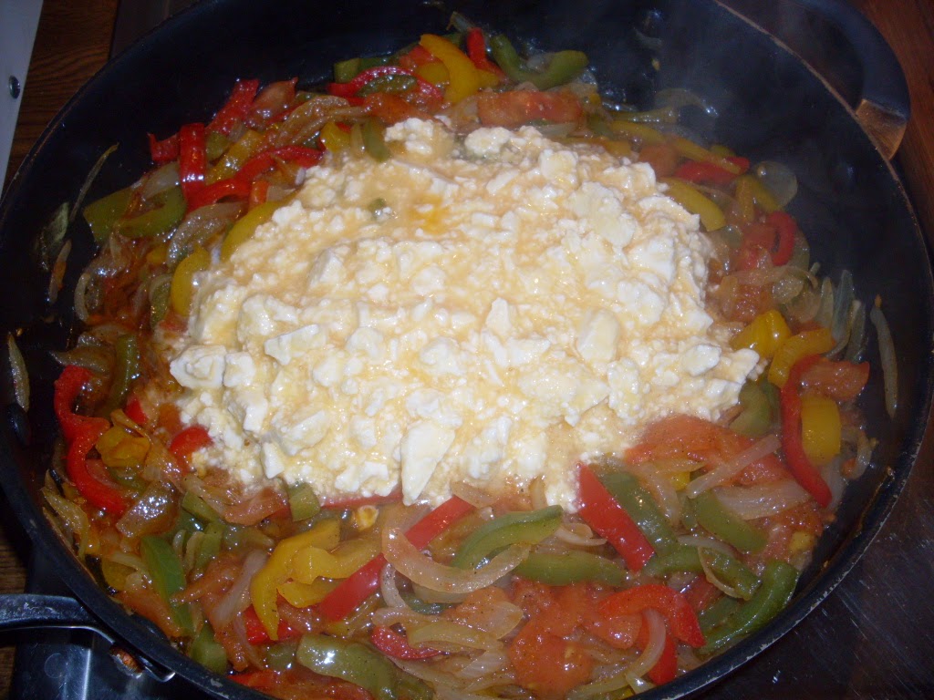 - Разбивам яйцата и натрошавам сиренето, но на едро при яйцата. Разбърквам леко.