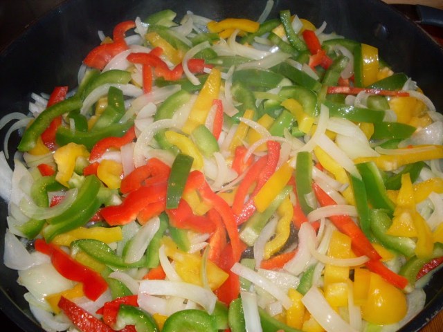 - Пускам лентичките лук и намалявам котлона с една степен – на 2. Задушавам лука не повече от 3 – 4 минути. В момента в който промени цвета си и леко поомекне – добавям чушките.