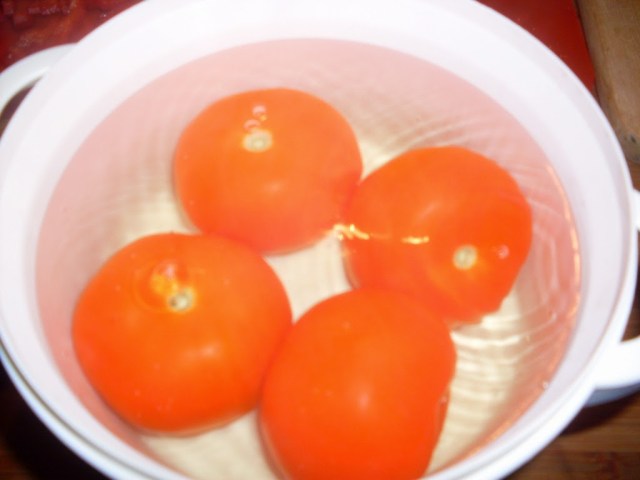 - Заливам доматите с вряла вода. Постояват около 5 минути във водата и така по-лесно ги обелвам. Нарязвам на кубчета.