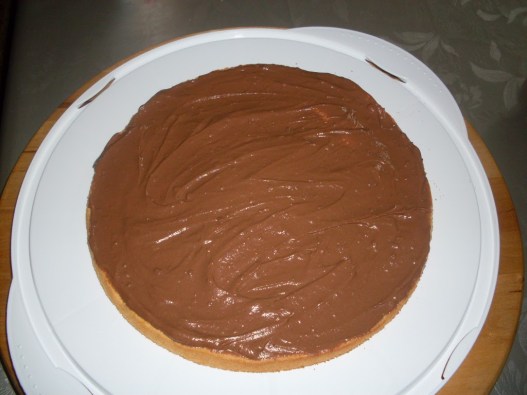 - Поставям първия блат върху подноса, с който ще се сервира или транспортира тортата. Намазвам с първото количество крем. Слагам втория блат, намазвам, третия блат, намазвам и така до петия блат. Един блат /който прецените, че е с най-добър външен вид/ оставям на страна за декорация на тортата. Петият блат намазвам също с крем.