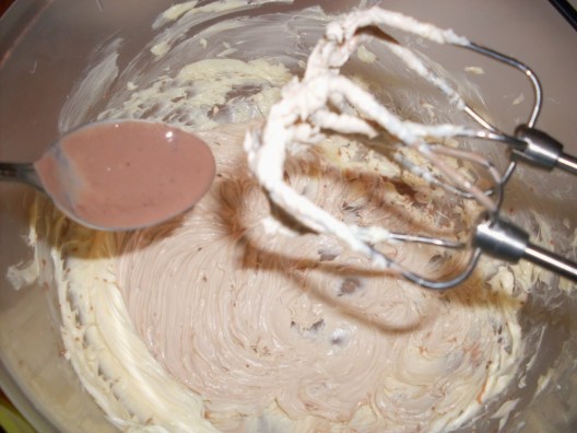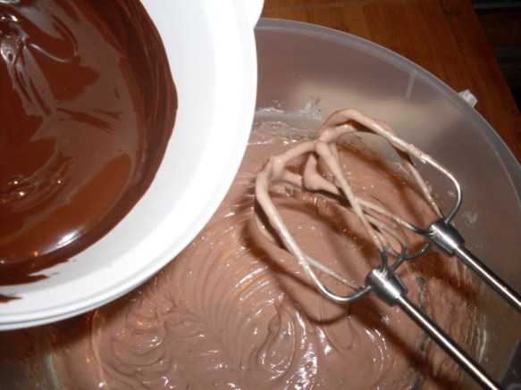 - Изстиналият шоколад добавям на струйка към масления крем и разбивам непрекъснато с миксера.