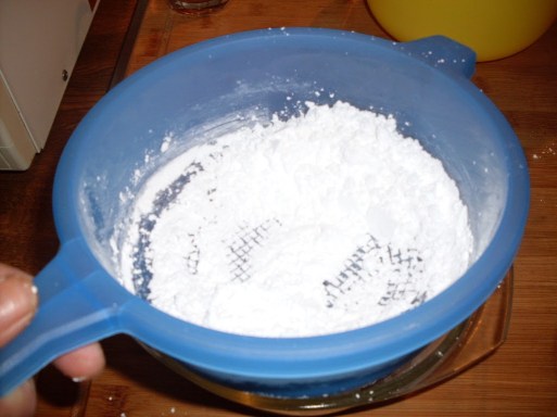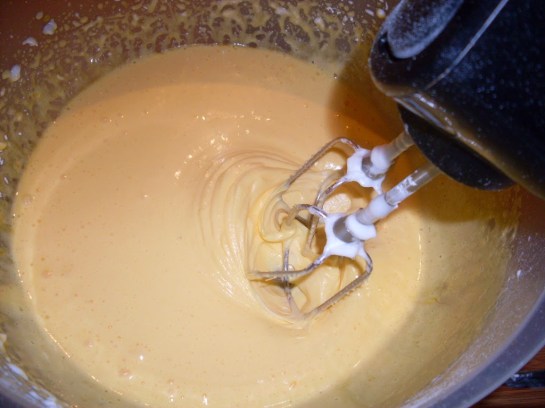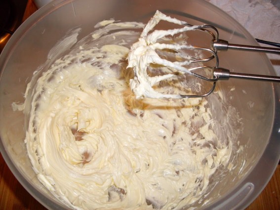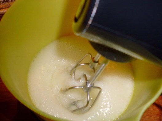- Разбивам белтъците с помощта на миксер. В момента, в който те променят цвета си – побелеят, започвам да добавям от пресятата пудра захар по малко и продължавам да разбивам на максимална мощност на миксера.