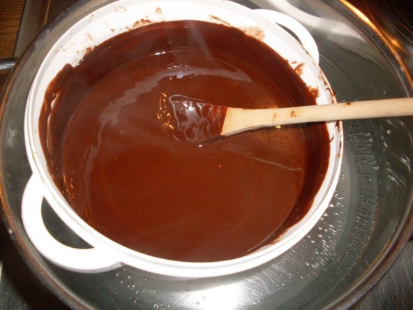 - Разтопявам кувертюра /шоколада/ на водна баня, като внимавам водата да не ми завира. Работя винаги на минимална степен на котлона. Оставям шоколада на страна да изстине.