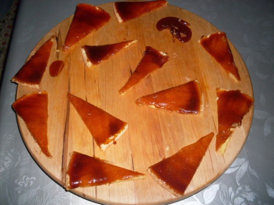 - С помощта на остър и потопен в олио или масло нож /аз използвах резец за пица/ нарязвам карамеления блат на 12 горе-долу равни триъгълничета. Непрекъснато топя ножа в мазнина. Така избягвам залепването на карамел по ножа.