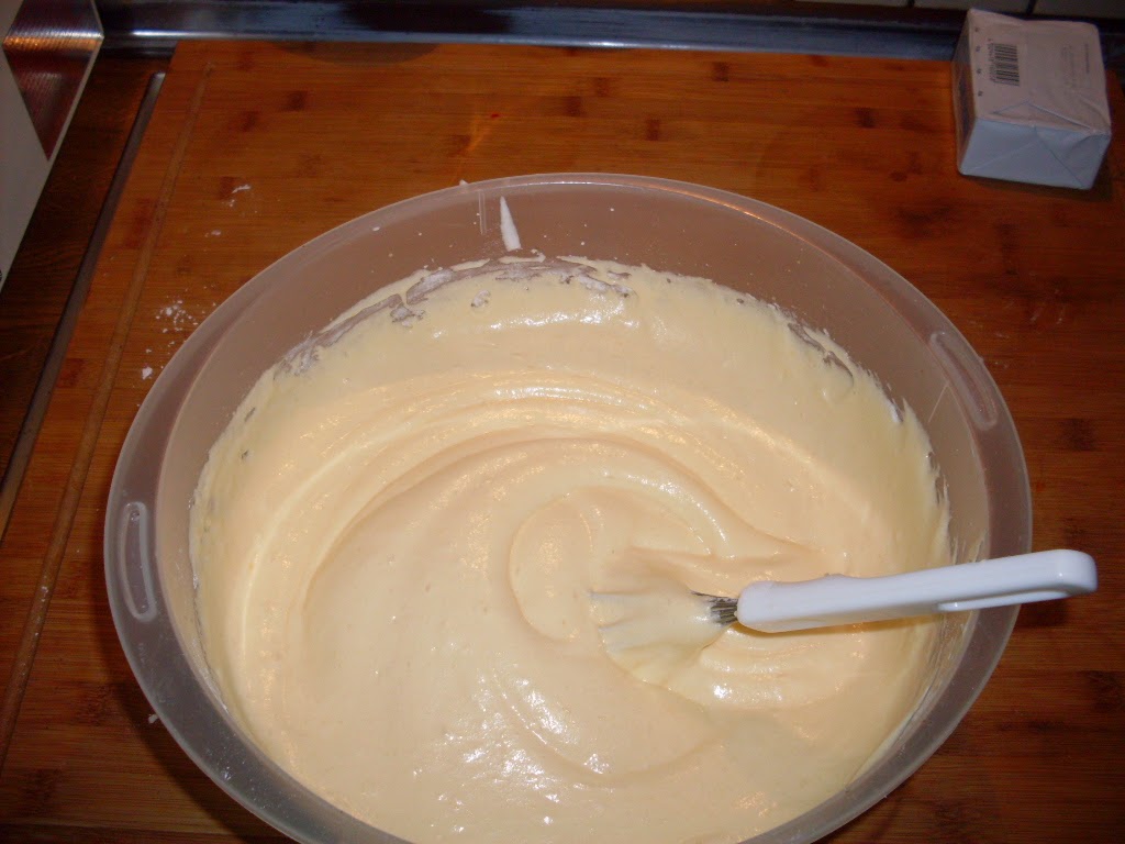 - От готовия вече маслен крем, отделям първо 6 пълни супени лъжици, за намазване на тортата отстрани.