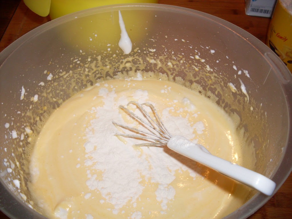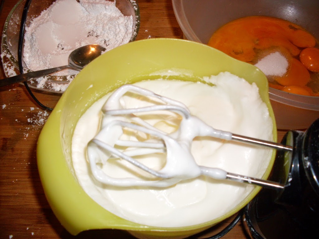 - Започвам да добавям по малко от белтъците и много внимателно разбърквам с тел за разбиване.